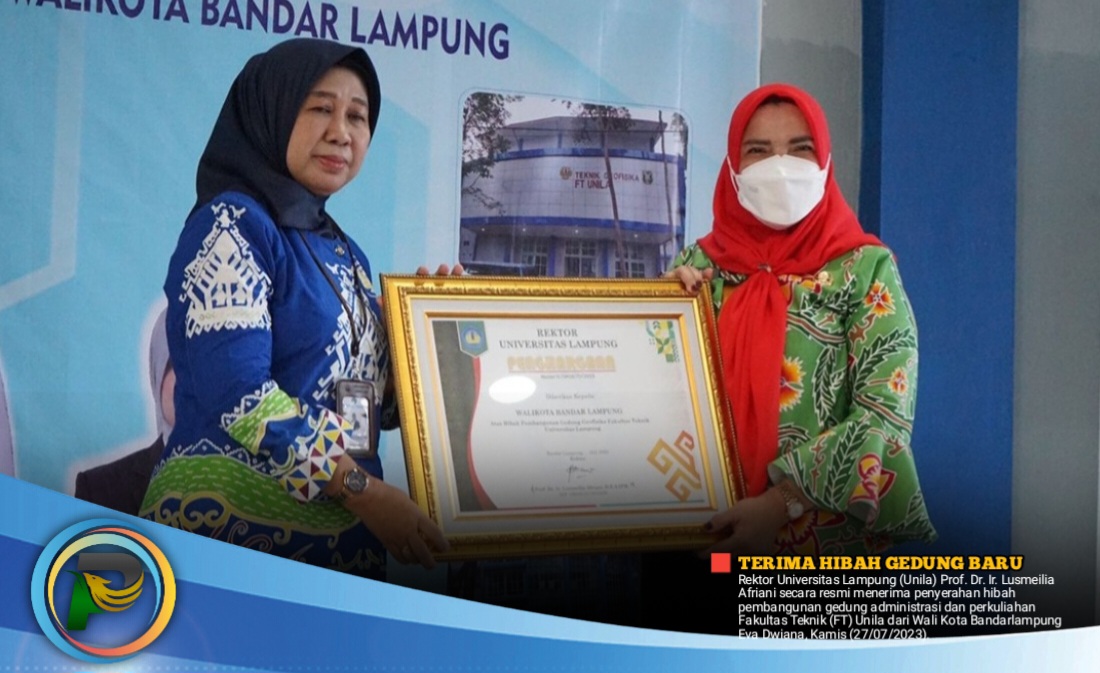 psiaceh.or.id/ – Rektor Universitas Lampung (Unila) Prof. Dr. Ir. Lusmeilia Afriani secara resmi menerima penyerahan hibah pembangunan gedung administrasi dan perkuliahan Fakultas Teknik (FT) Unila dari Wali Kota Bandarlampung Eva Dwiana, Kamis (27/07/2023).